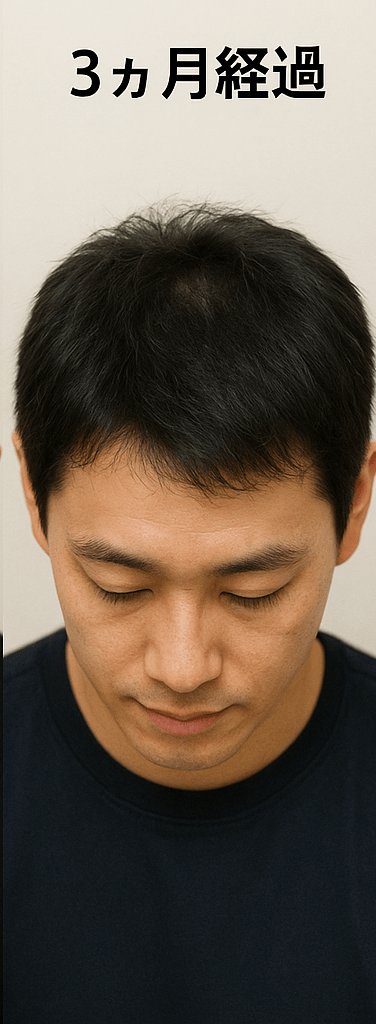 | 1ヶ月経過 | 劇的な変化はないが、洗髪後の抜け毛がわずかに減った気がする。 | 変化は感じられない。 | ![]() |