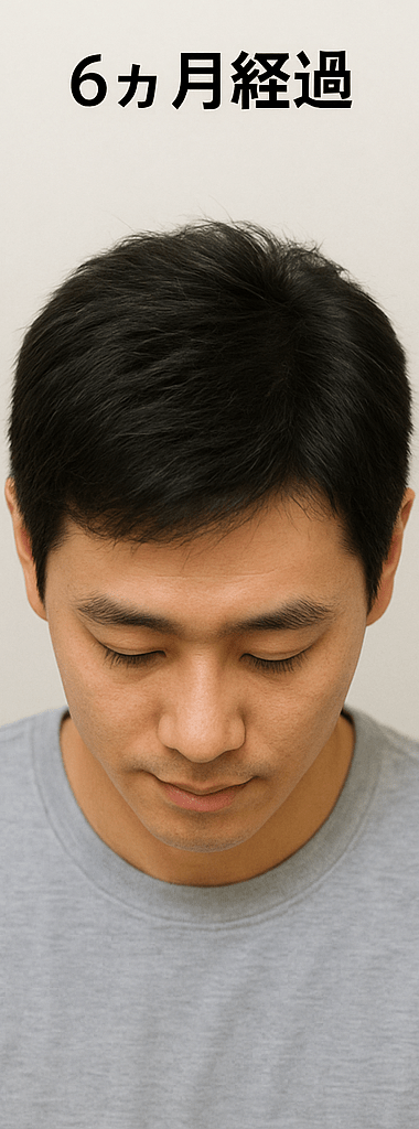 | 6ヶ月経過 | 抜け毛の減少が安定。使用を止めると再び増えるという口コミもあったため、継続を決意。 | 髪一本一本が太くなり、全体的なボリュームアップを実感。 | ![]() |